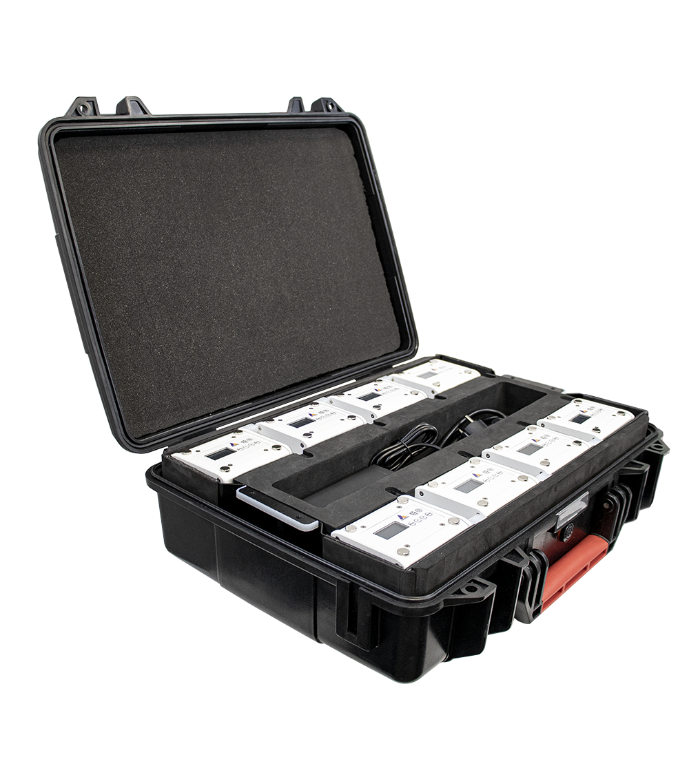 Transportný kufor s 8 kusmi PowerStation s možnosťou súčasného nabíjania. Umožňuje prepojenie pomocou bridge káblov k LED NYX žiarovkám (zo sady FP5-SET) pre jednoduché programovanie.