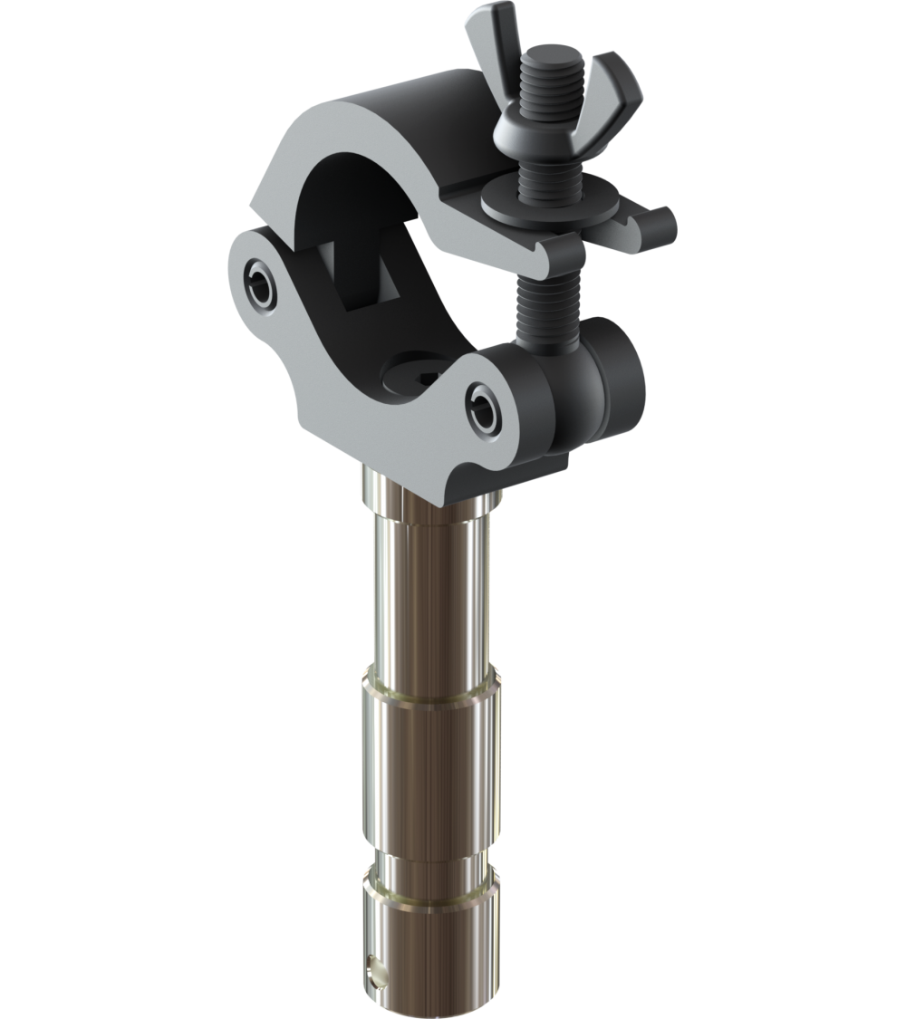 Slim aluminium clamp with spigot, 200 kg loading, 48-51 mm tubes, M10 bolt