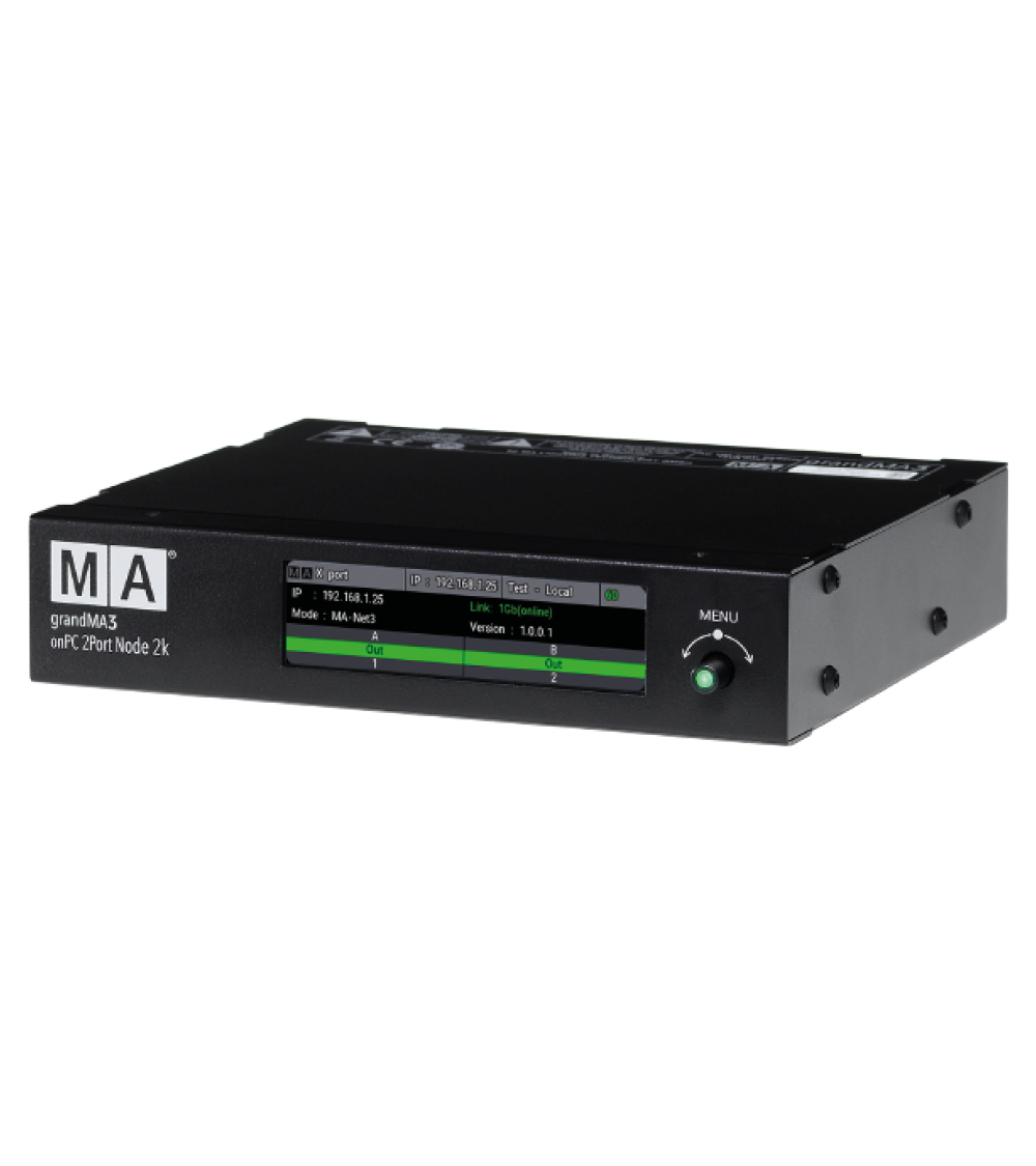 Niekoľko ďalších faktov? Všetky uzly grandMA3 onPC xPort dokážu spracúvať údaje MA-Net3, MA-Net2, sACN a Art-Net. Sú plne kompatibilné s RDM a na prednej strane majú 3,9" farebný displej na jednoduchú konfiguráciu a prehľad o stave. Veľká výhoda pre inštalácie: Variant PoE (Power over Ethernet) nevyžaduje žiadnu dodatočnú napájaciu kabeláž!