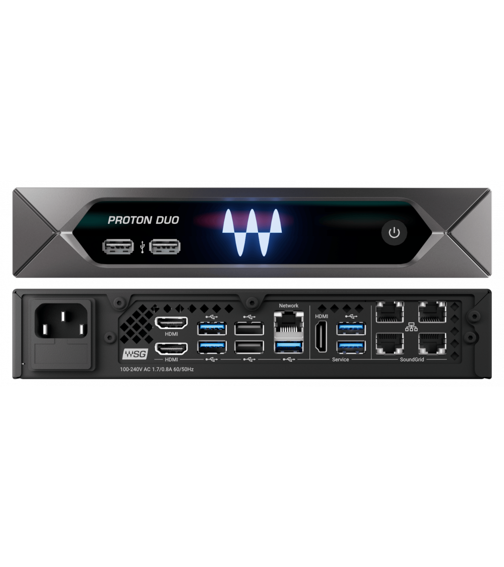 Štíhly a elegantný Proton Duo kombinuje Waves Proton SoundGrid server, Axis Proton Waves-optimalizovaný počítač a vstavaný sieťový switch. Po prvýkrát môžeš pridať výkon pre spracovanie pluginov a spúšťať Waves aplikácie ako eMotion LV1 alebo SuperRack pomocou jedného kompaktného zariadenia namiesto dvoch samostatných jednotiek.