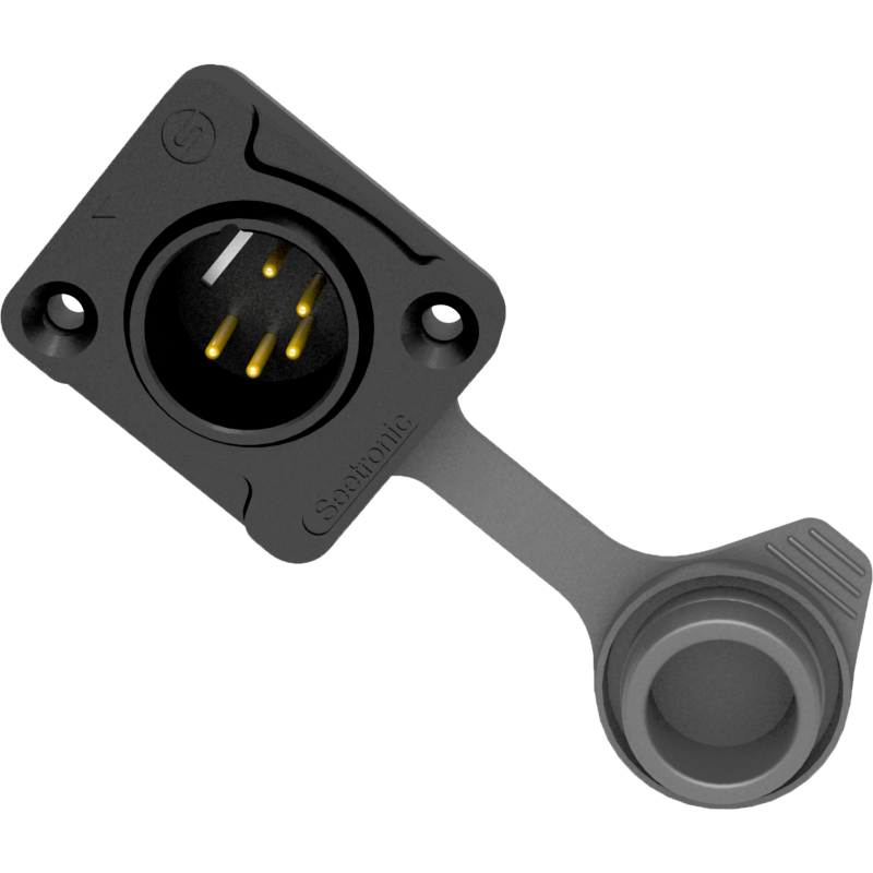 XLR male 5 pin connector, black metal body with cover, IP65