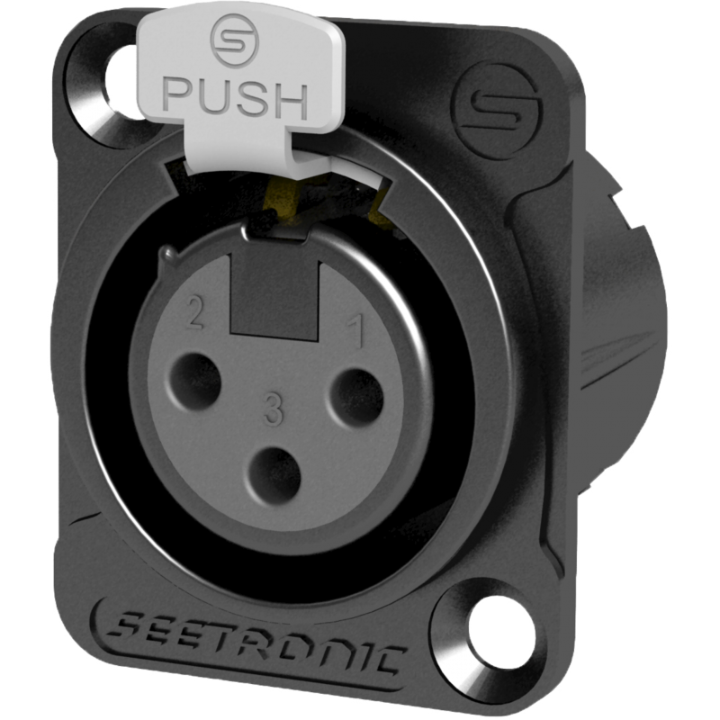 XLR 3-pin female panel connector, black metal body with silver contacts